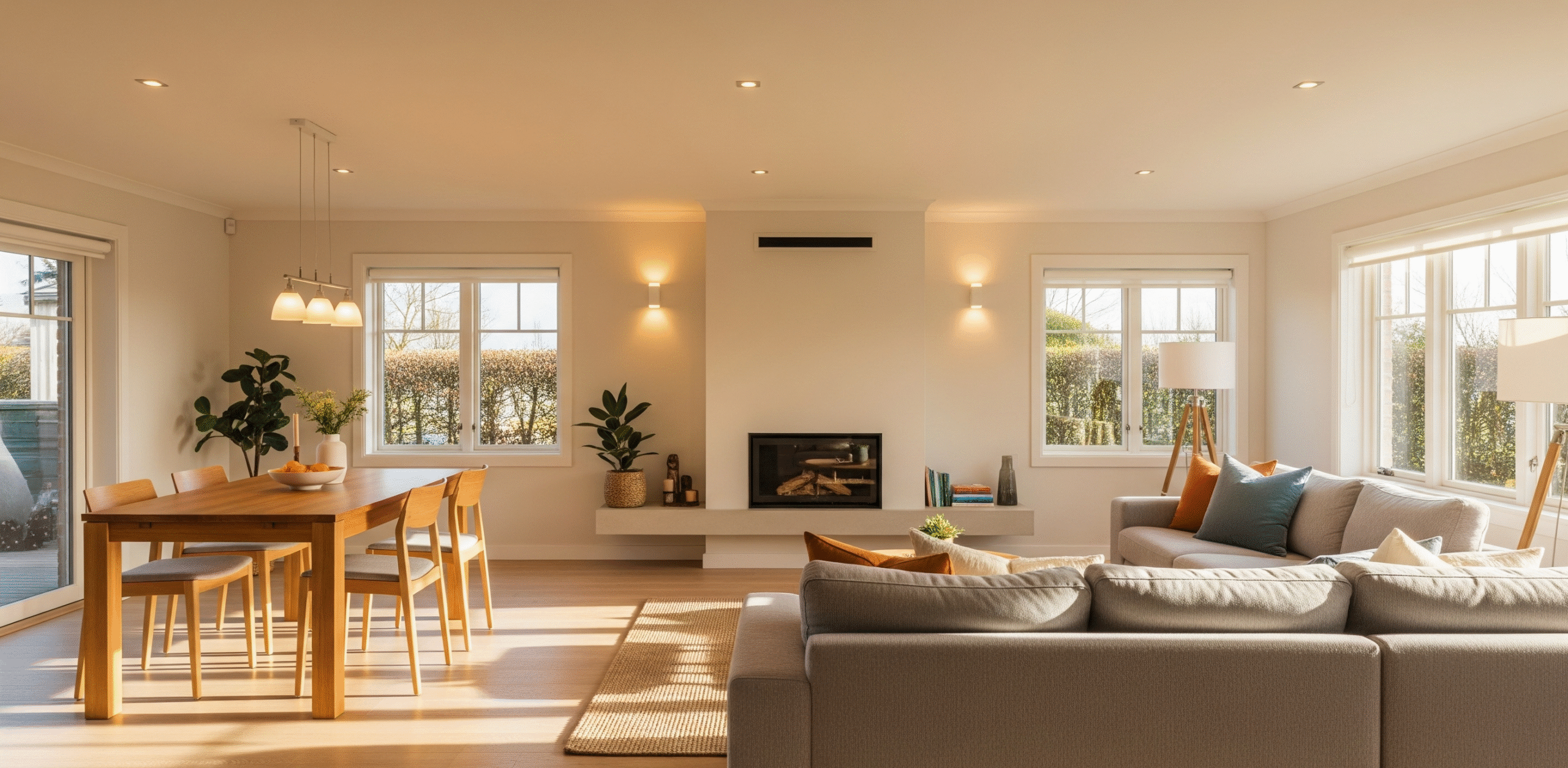- Timber laminated flooring in open living area.