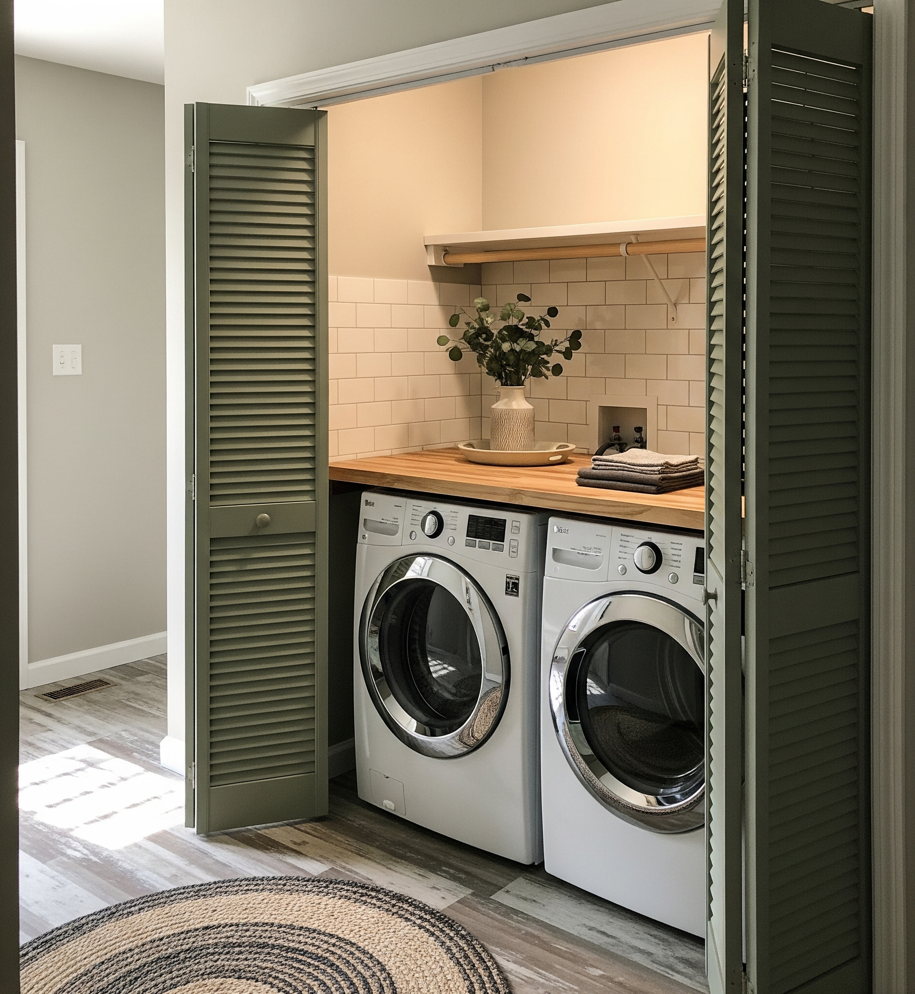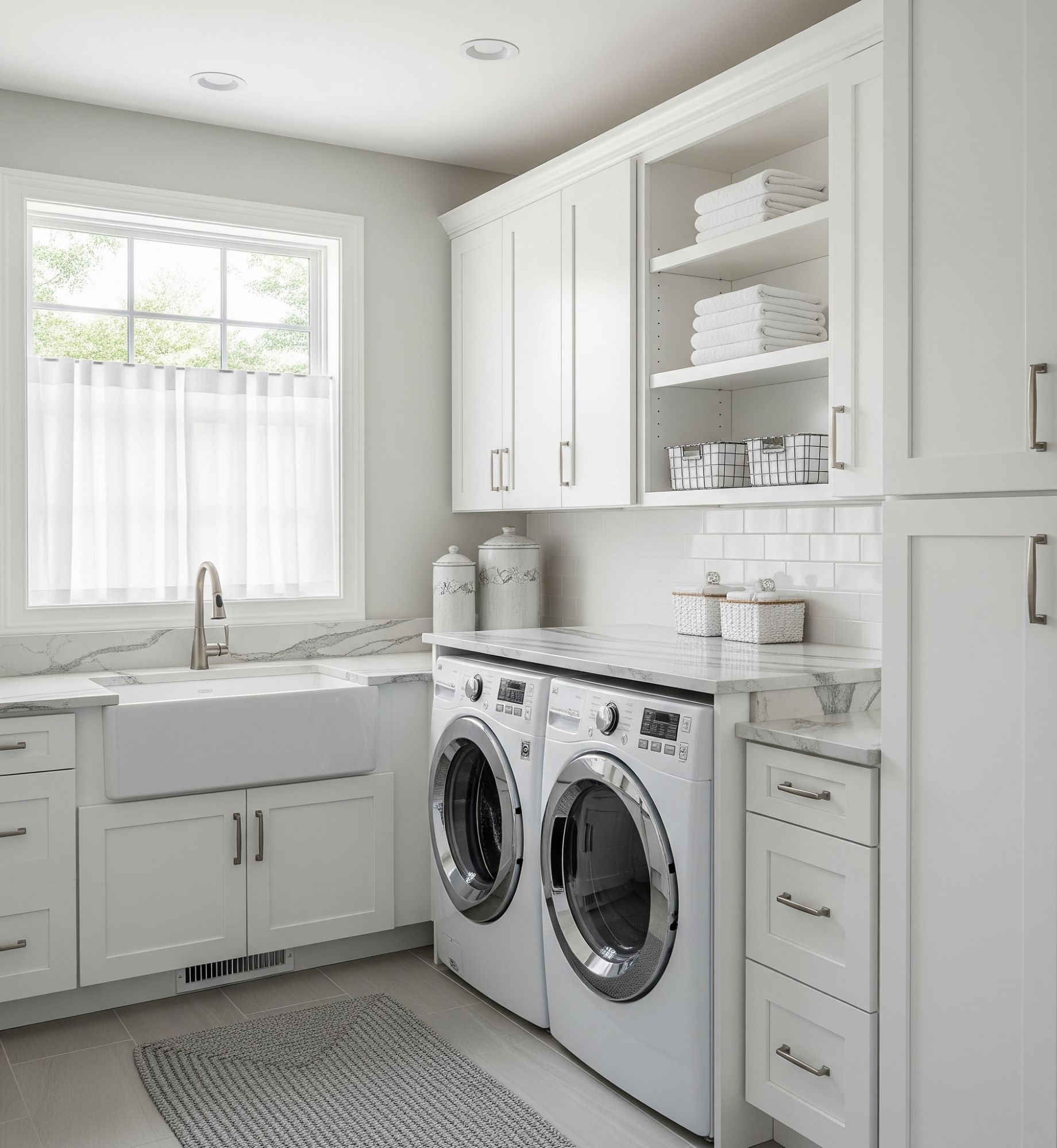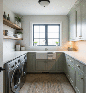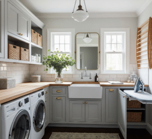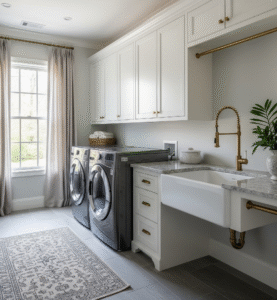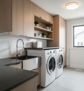 Lafayette Builders can create rustic and farmhouse-style laundries that emphasise warmth, charm, and timeless character. This design style embraces natural materials and earthy tones, with cabinetry in woodgrain finishes, shaker-style doors, or soft, muted colours. To enhance the authentic farmhouse look, features such as wrought iron hardware, exposed-style fittings, or sliding barn doors can be incorporated. These details not only elevate the rustic appeal but also keep the space practical and welcoming. With Lafayette’s expert craftsmanship, your laundry will strike the perfect balance between functionality and cosy charm, delivering a space that feels both inviting and beautifully handcrafted.