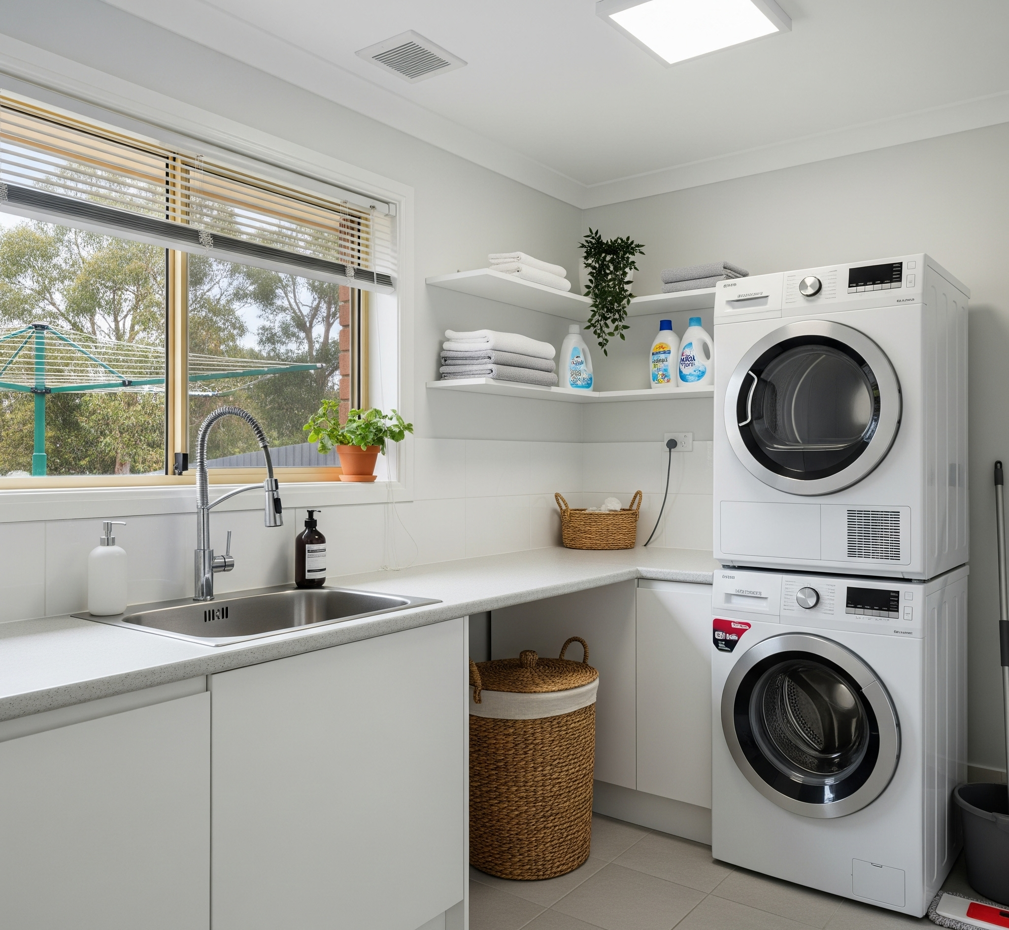 Lafayette Builders brings coastal-inspired style to your laundry with designs that feel fresh, light, and relaxed. Bright white cabinetry, soft colour accents, and natural textures create a breezy, open atmosphere reminiscent of seaside living. Our high-gloss white cabinets are ideal for this look, reflecting light to maximise brightness and enhance the sense of space. For those who prefer a more traditional coastal feel, shaker-style doors add texture and timeless charm, perfectly complementing the design. With Lafayette’s expertise, your coastal laundry will combine practicality with an airy, calming aesthetic—transforming everyday tasks into moments of ease and coastal-inspired comfort.