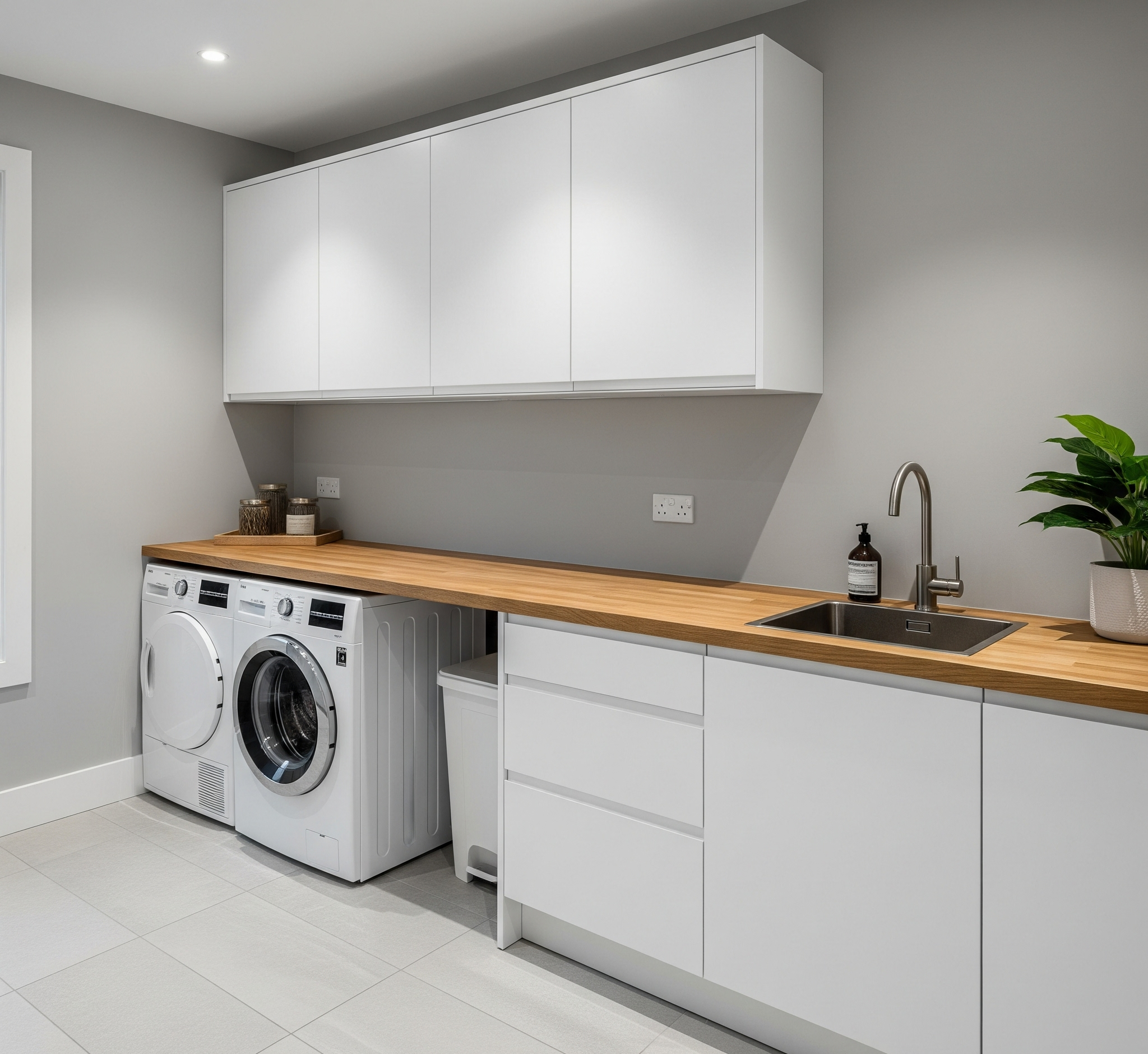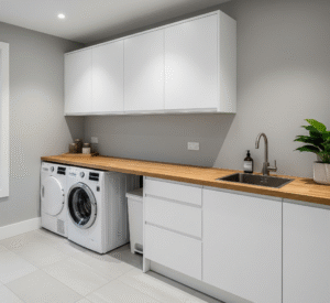 The finish you choose for your laundry cabinets plays a key role in defining the space’s overall style. Matte finishes offer a sleek, subtle look, while high-gloss finishes bring a polished, contemporary edge that reflects light and enhances brightness. For a warm, organic feel, wood grain textures add natural charm and visual depth. At Lafayette Builders, our high-gloss finishes remain a favourite in modern laundry designs for their stylish appeal, light-enhancing qualities, and exceptional durability. Resistant to moisture and everyday wear, they are an ideal choice for creating a laundry that is both practical and effortlessly sophisticated.