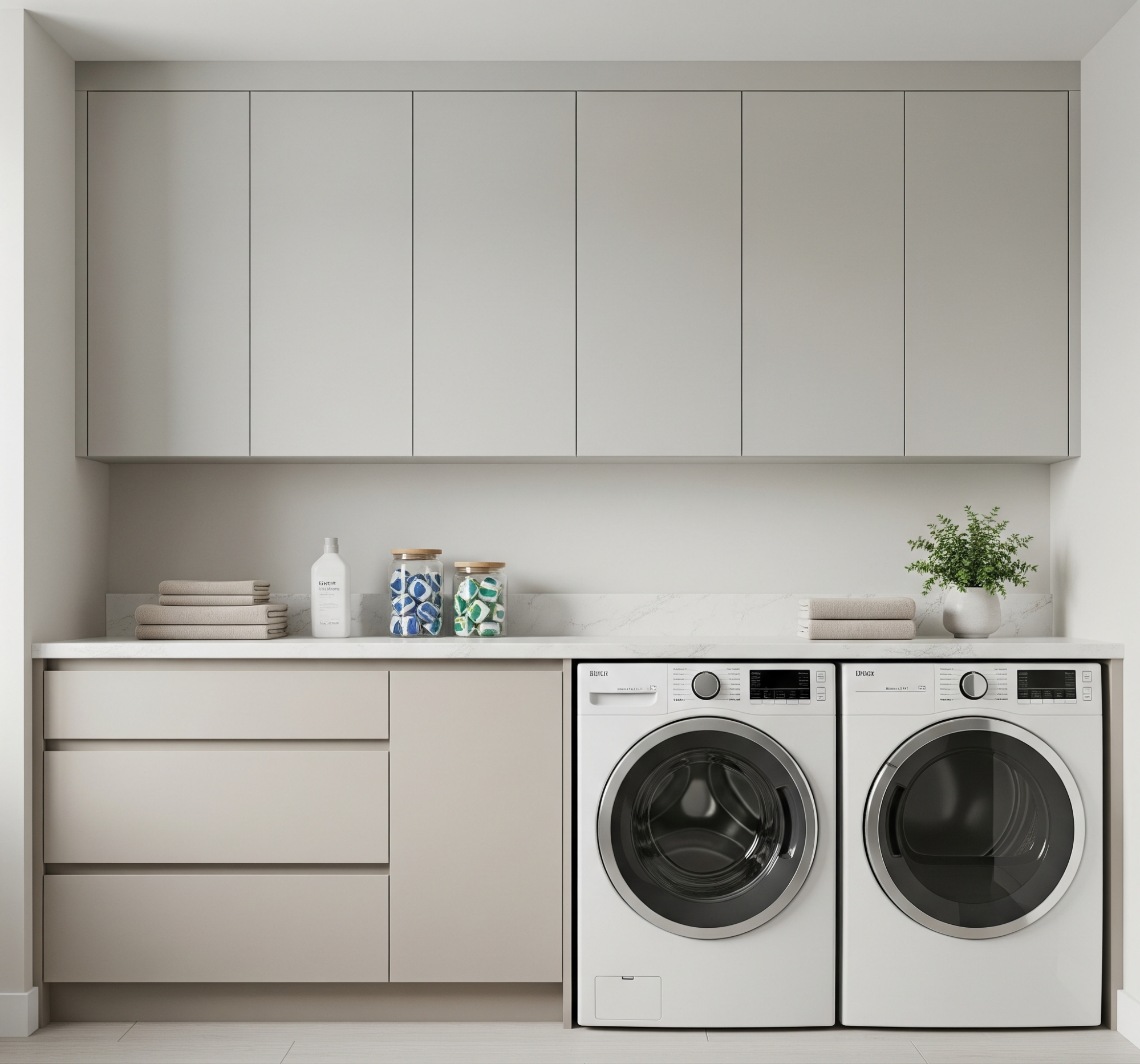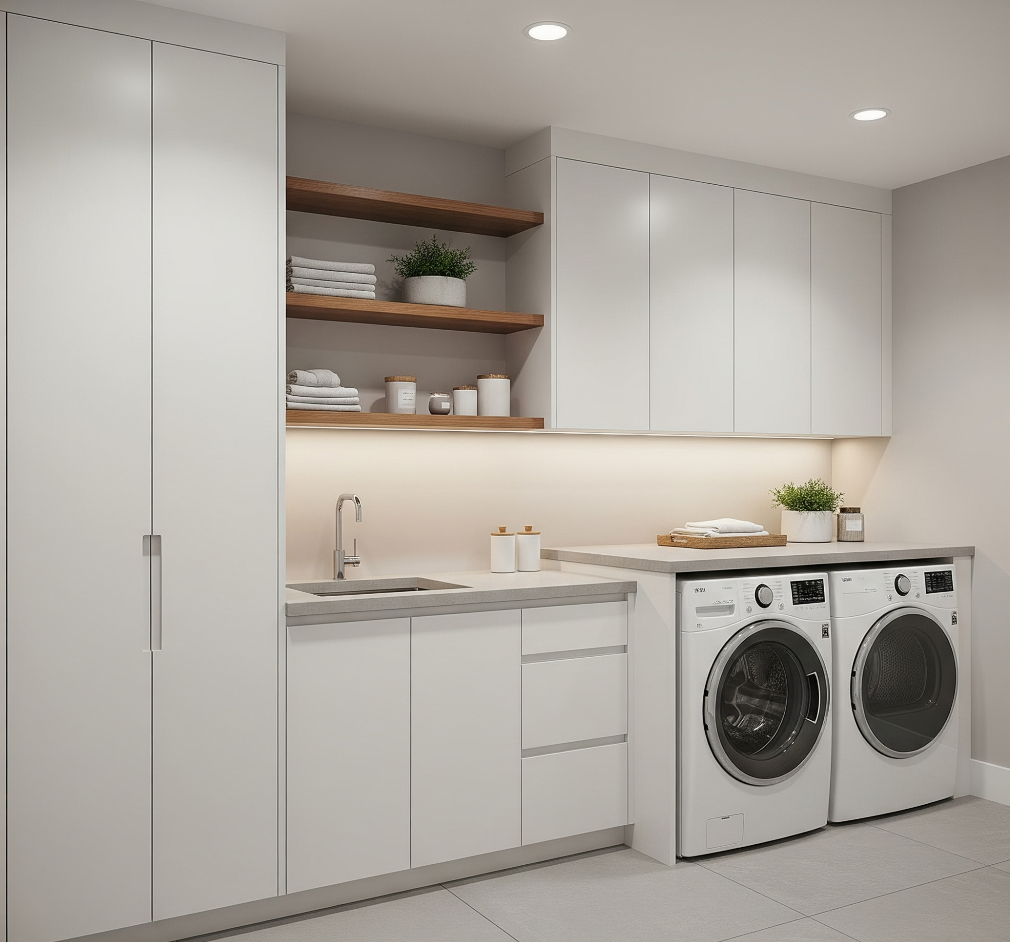 For a softer, warmer alternative to classic white, Lafayette Builders offers laundry cabinets in timeless neutral tones such as grey, beige, and soft taupe. These versatile shades complement a wide range of design styles—from traditional to modern—adding gentle depth and character without overpowering the room. Neutral cabinetry creates a calm, welcoming atmosphere that works beautifully in both small and large laundries. Their understated elegance makes them a safe yet stylish choice, allowing for easy pairing with different benchtops, splashbacks, and flooring options. With Lafayette’s quality finishes, neutral-toned cabinets deliver lasting beauty and functionality for a refined, balanced laundry space.